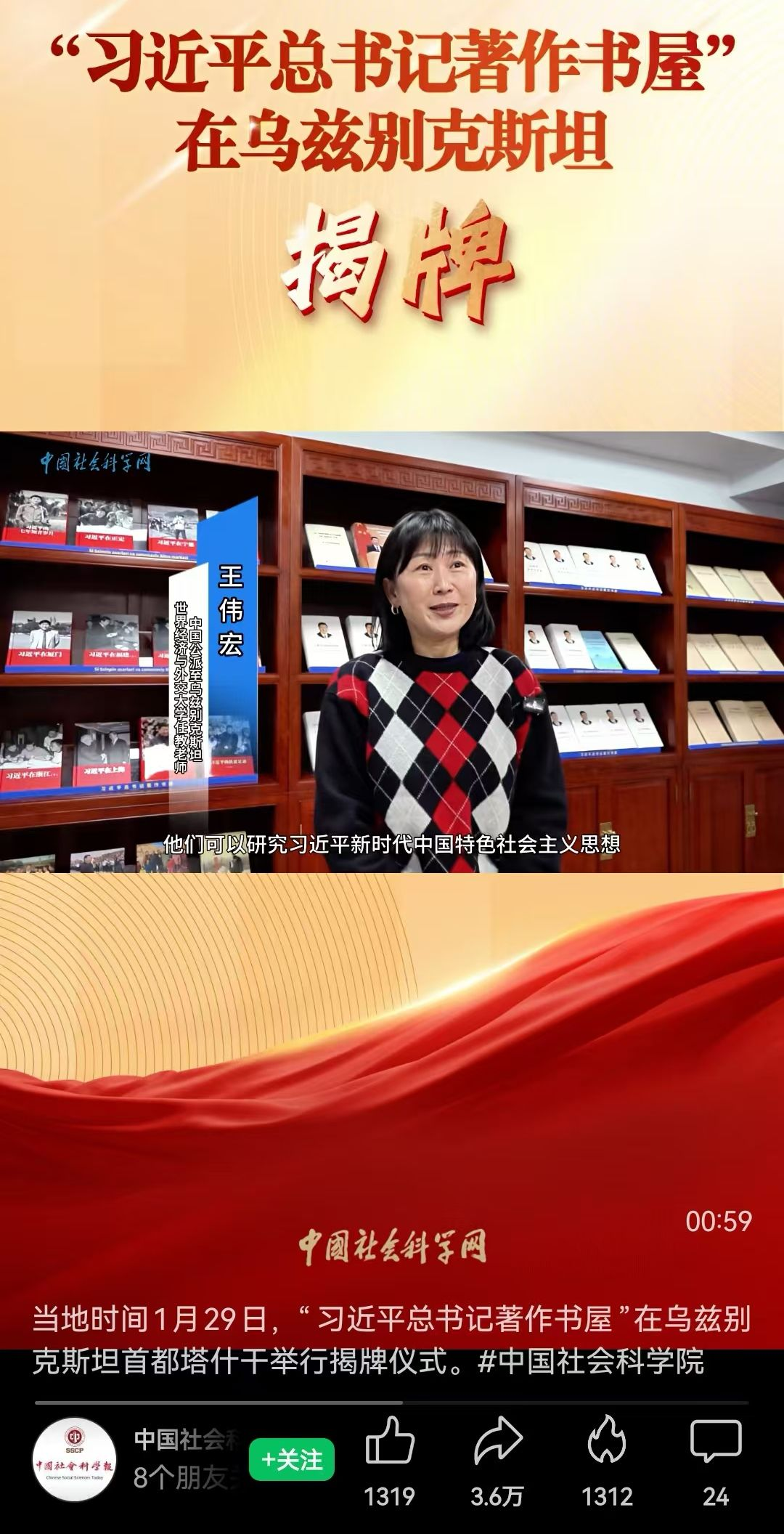 根据工作需要,我校交通运营服务系教师王伟宏被国家教育部中外语言交流合作中心公派至乌兹别克斯坦世界经济与外交大学任教,当地时间1月29日,她深度参与的“习近平总书记著作书屋”在乌兹别克斯坦首都塔什干举行揭牌仪式,中国社会科学院院长高翔、乌兹别克斯坦最高会议参议院第一副主席兼世界经济与外交大学校长萨法耶夫共同为书屋揭牌,中国驻乌兹别克斯坦大使于骏等嘉宾出席仪式。王伟宏接受中国社会科学网专题采访和报道。